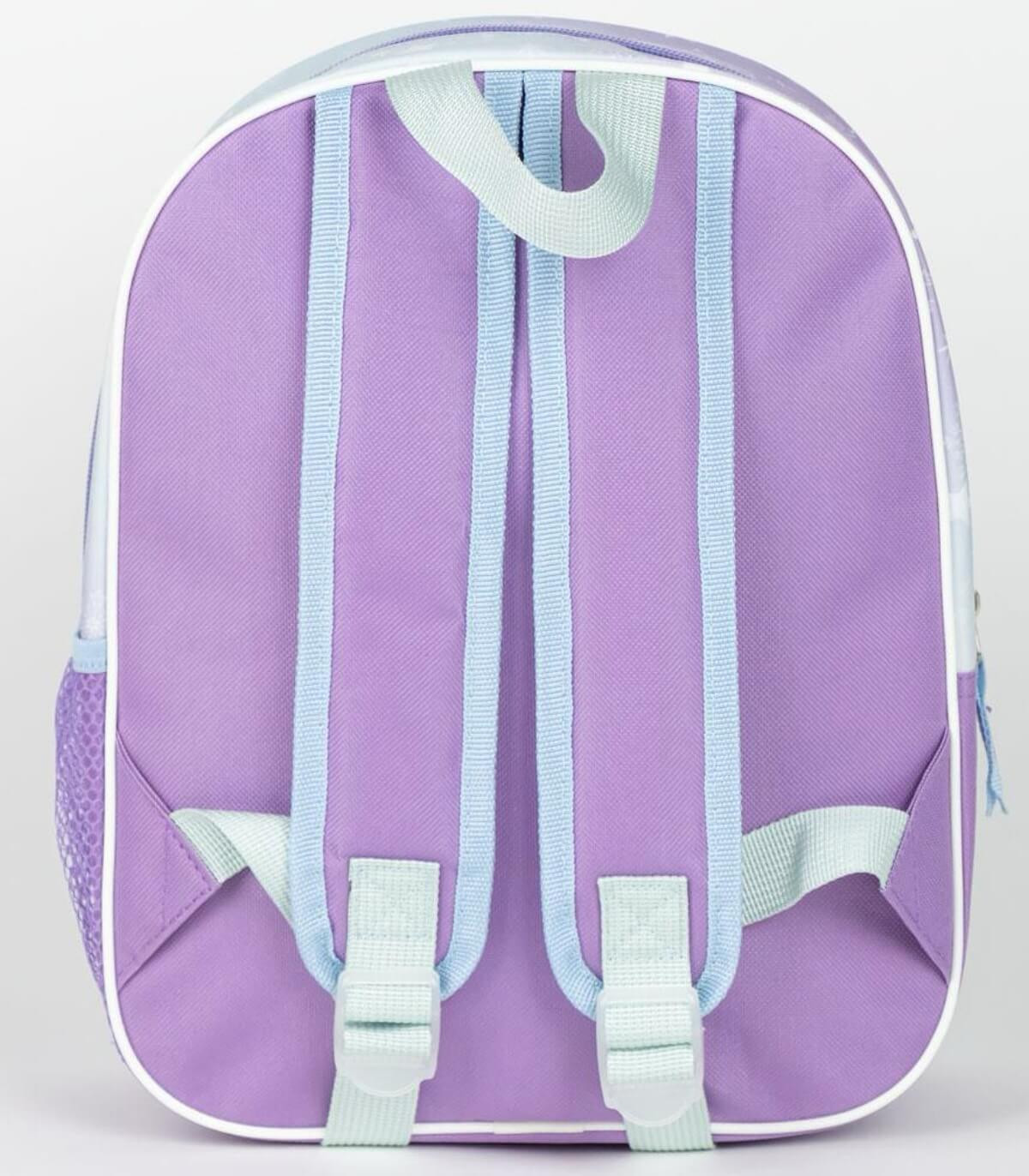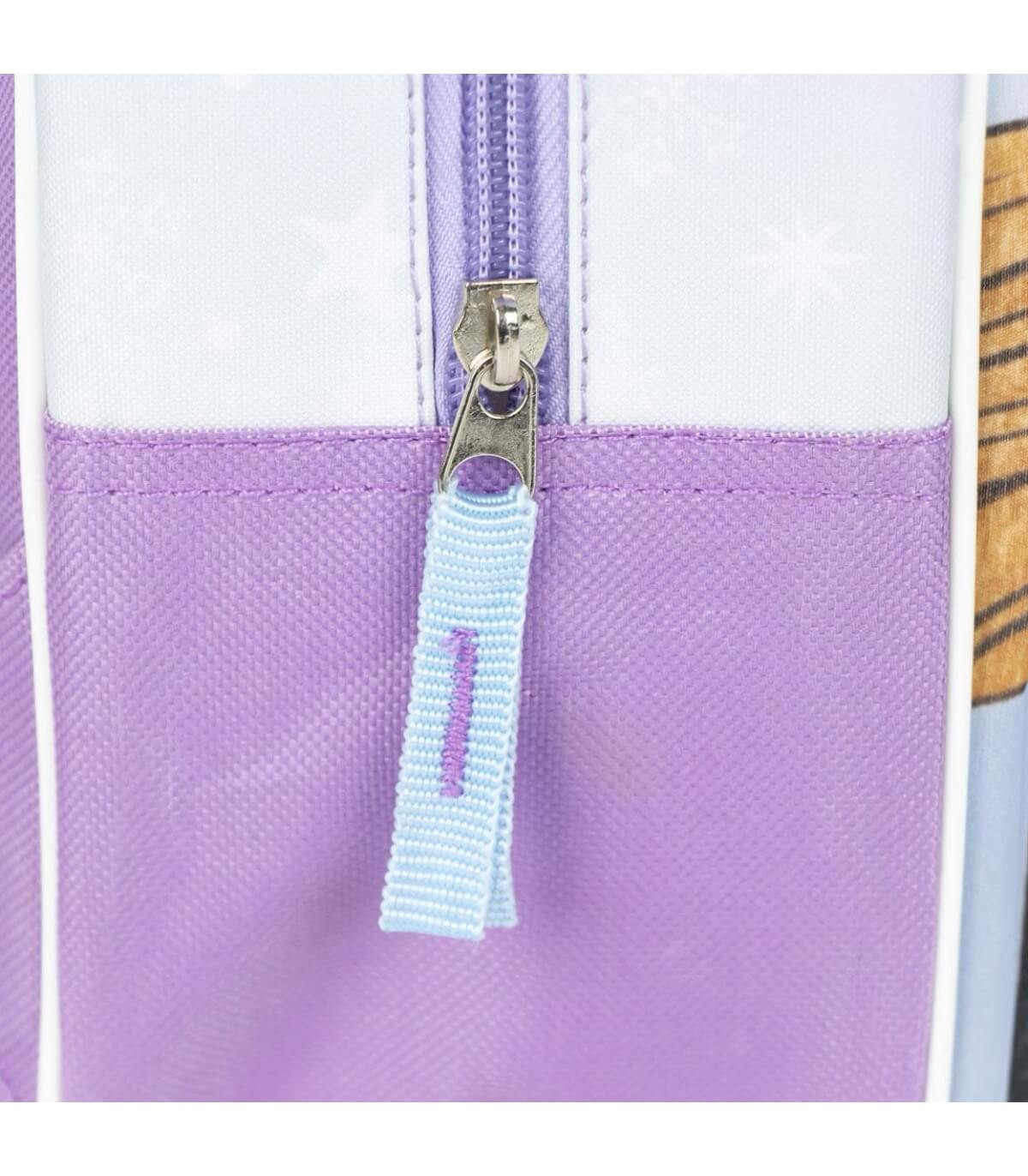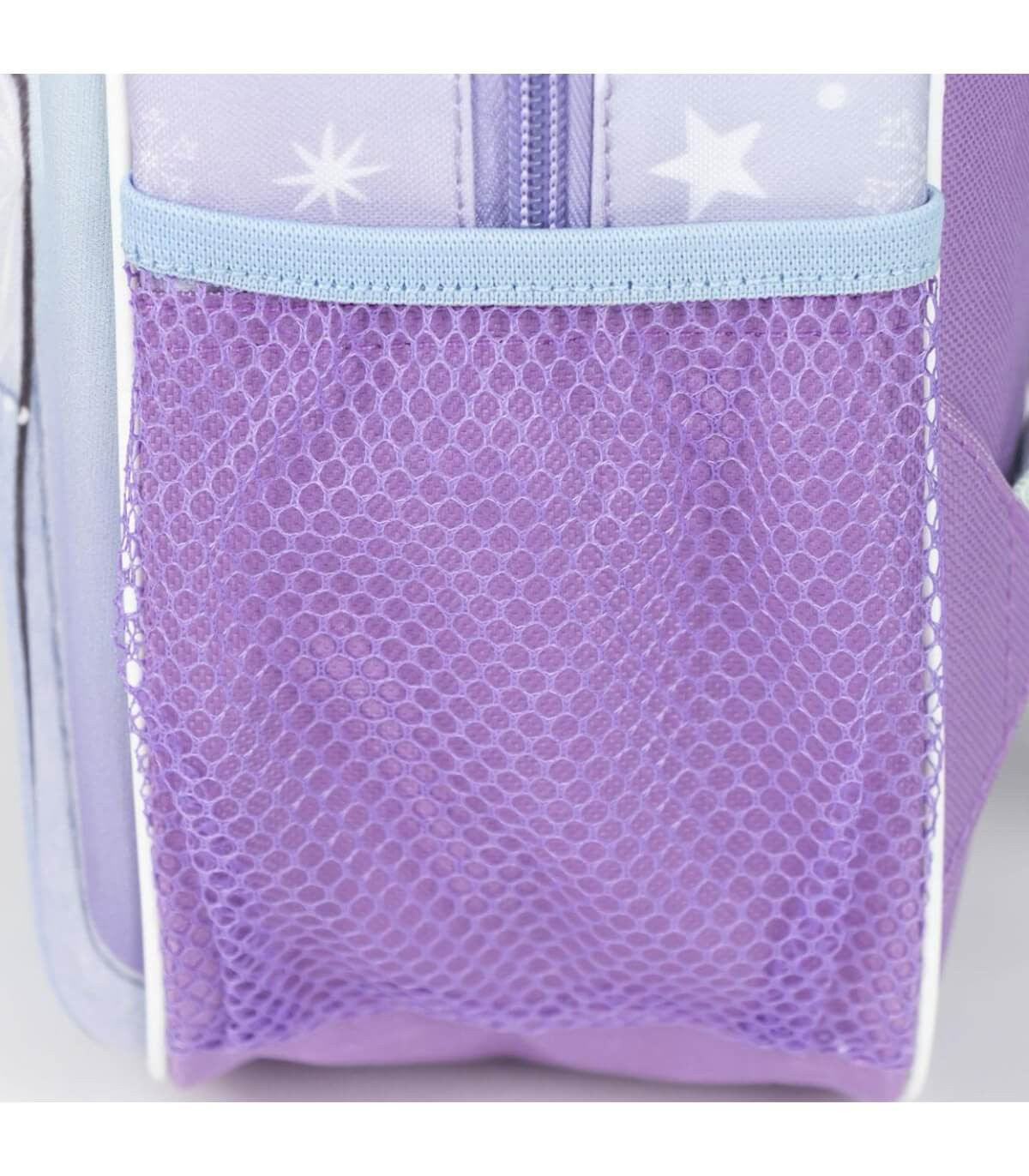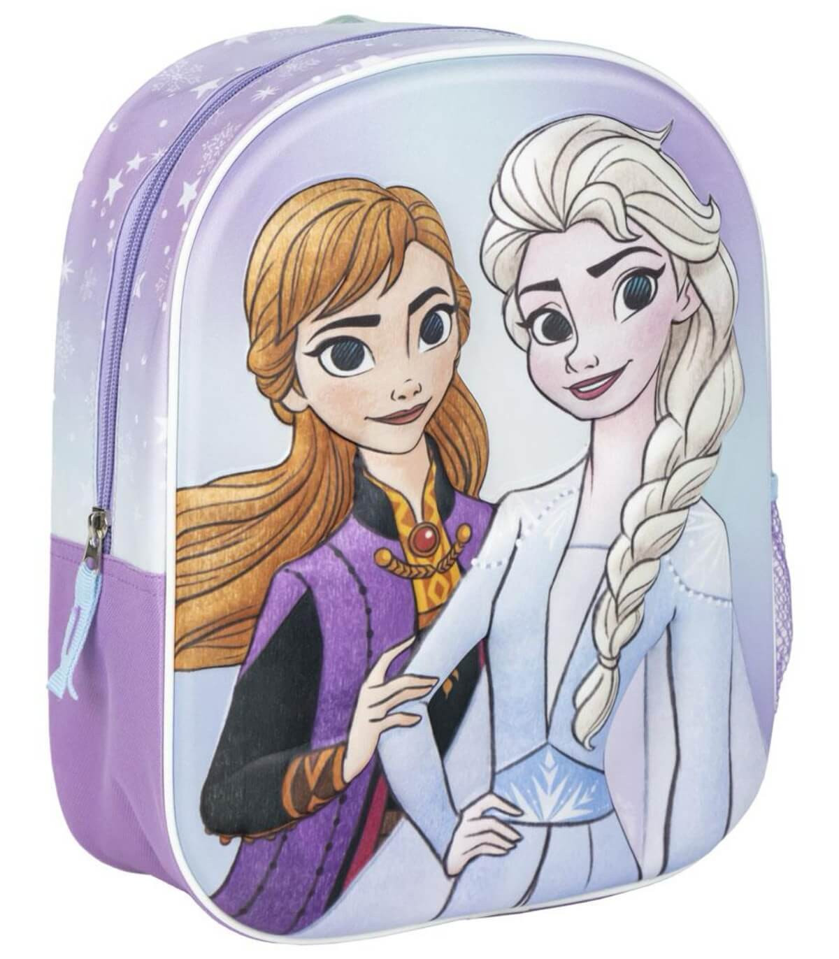 Раница за детска градина и предучилищна възраст Замръзналото кралство: Анна и Елза, изработена по европейски дизайн, на испанския производител Cerda. С 3D панел, едно основно отделение с цип, страничен мрежест джоб, подплатени регулируеми презрамки и дръжка за носене в ръка. Подходящо за момичета от 3 до 6 години.