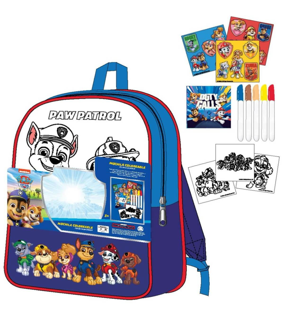 Раница за оцветяване Пес Патрул, изработена по европейски дизайн, на испанския производител Cerda. С едно основно отделение с цип, подплатен гръб, подплатени регулируеми презрамки и дръжка за носене в ръка. Съдържа: 5 маркера, 1 книжка за рисуване с 10 страници, 3 листа стикери. Подходящо за момичета и момчета над 3 години.