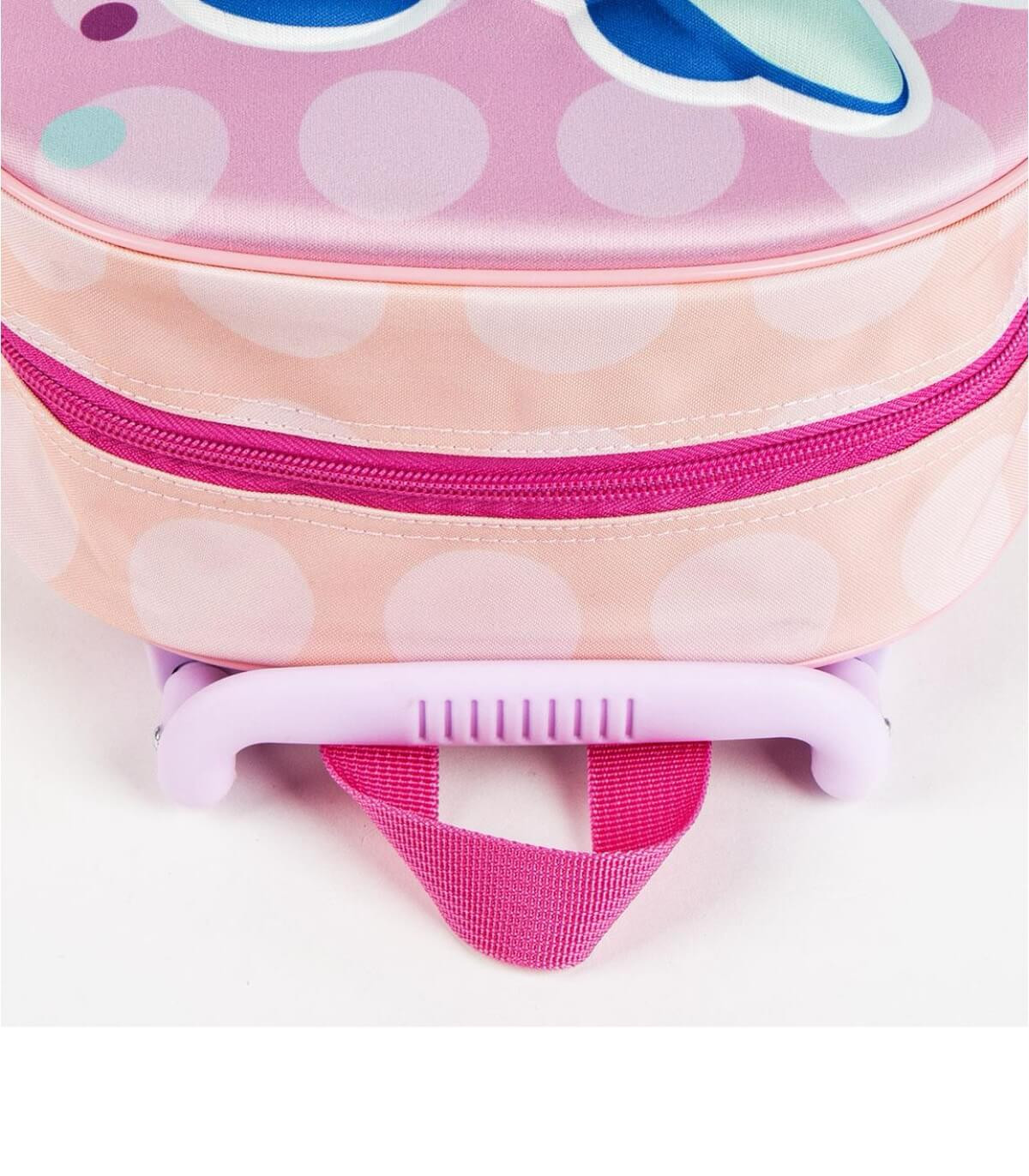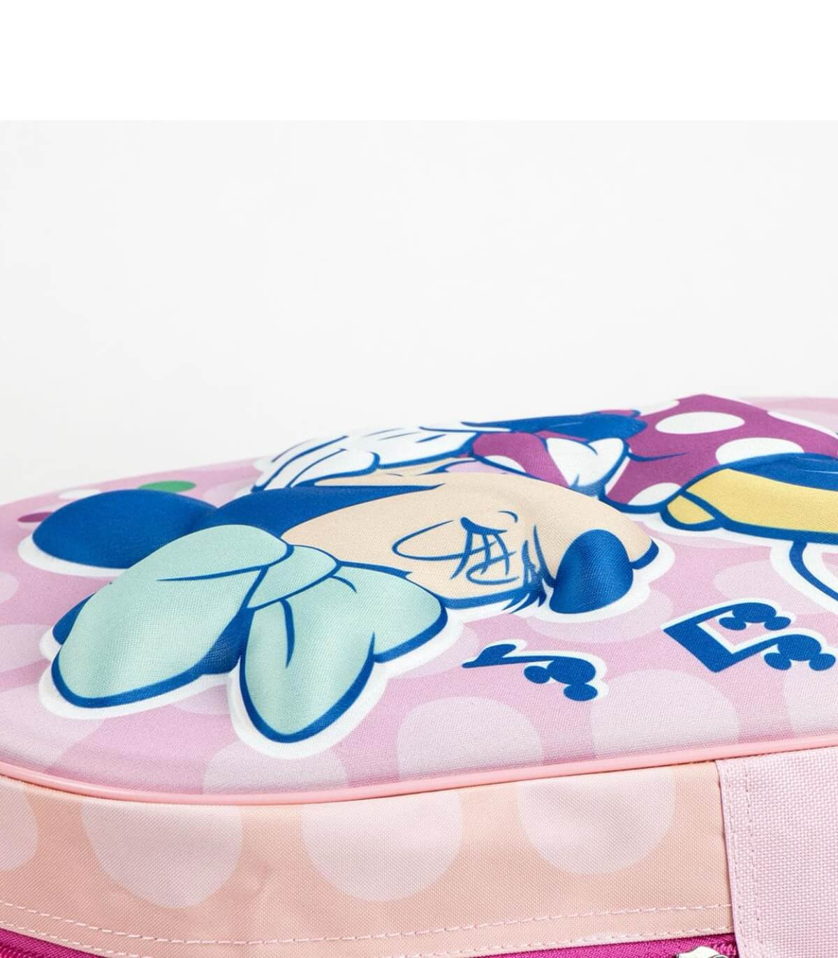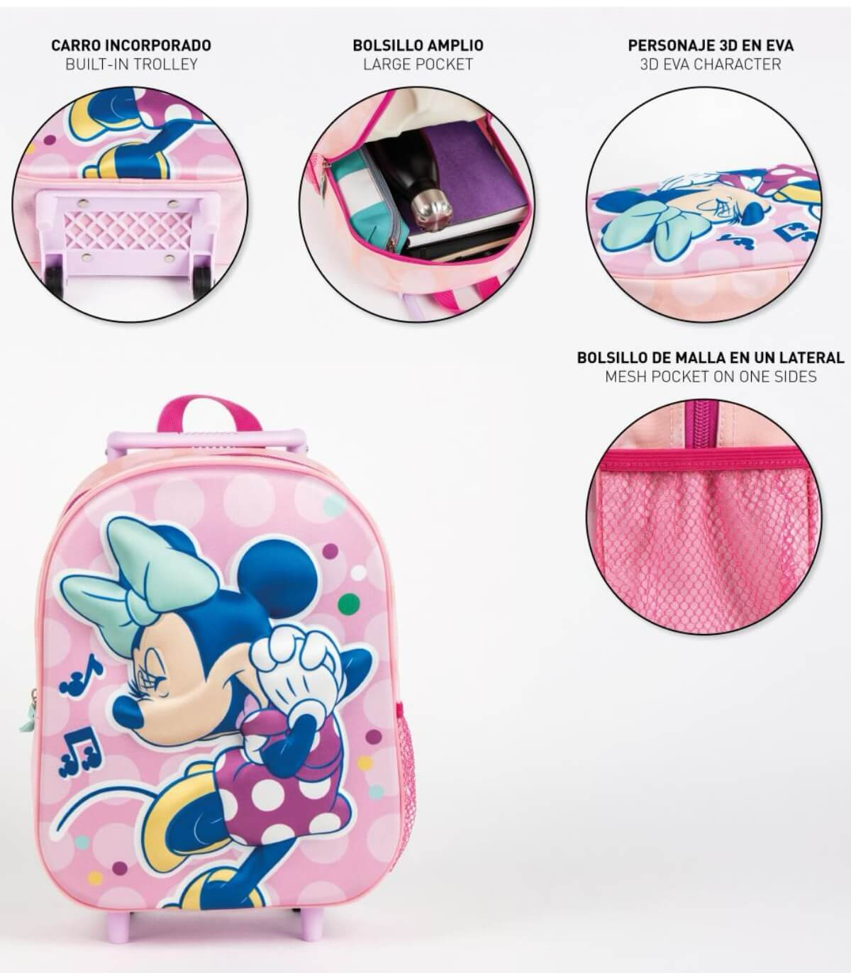 Раница за предучилищна възраст Мини Маус, изработена по европейски дизайн, на испанския производител Cerda. С 3D панел, едно основно отделение с цип, страничен мрежест джоб, дръжка за носене в ръка, телескопична дръжка и колелца. Подходящо за момичета от 3 до 6 години.