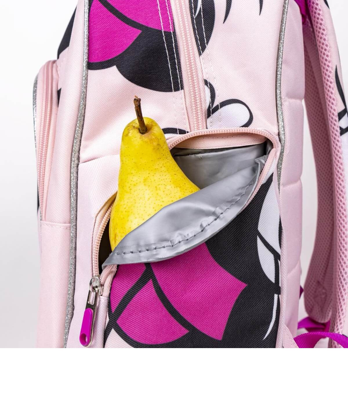 Раница за училище Мини Маус, изработена по европейски дизайн, на испанския производител Cerda. С едно основно отделение с двоен цип, преден джоб с цип и органайзер за ученически пособия, страничен мрежест джоб, страничен джоб с цип, подсилено дъно, подплатен гръб, подплатени регулируеми презрамки и подплатена дръжка за носене в ръка. Подходящо за момичета от 6 до 13 години.