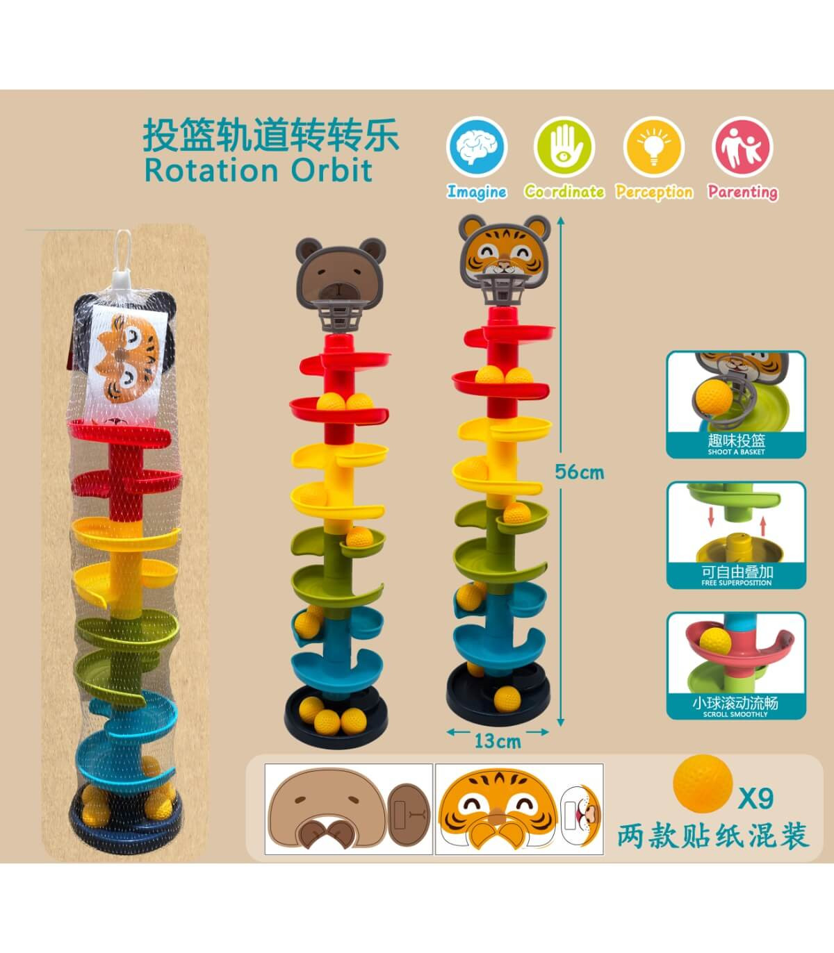 Образователна играчка кула с топчета. Състои се от основа, 8 спираловидни части, тигър с кош на върха, 9 топчета, стикер. Подходящо за момичета и момчета над 12 месеца.