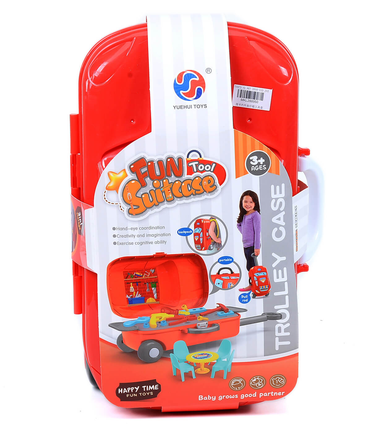 Детски комплект инструменти, предназначен за всички малки майстори! Ще намерите клещи, гаечен ключ, чук, отвертка, френски ключ, винтоверт и крепежни елементи. А всичко това е напълно достатъчно за един малък ремонт, че и по-голям! Комплектът идва в удобен червен куфар на колелца с 2 дръжки – обикновена и телескопична, за да можете да го носите навсякъде със себе си и да поправяте разни развалени неща. Но това не е всичко! Отворете куфара и го трансформирайте в работна маса, върху която да подредите инструментите. Има и малка масичка с 4 столчета за почивка. Ако поставите текстилните дръжки, ще превърнете куфара в раница. А със стикерите можете да го накарате да изглежда като кола. Толкова много екстри само в една играчка – забавно, нали?