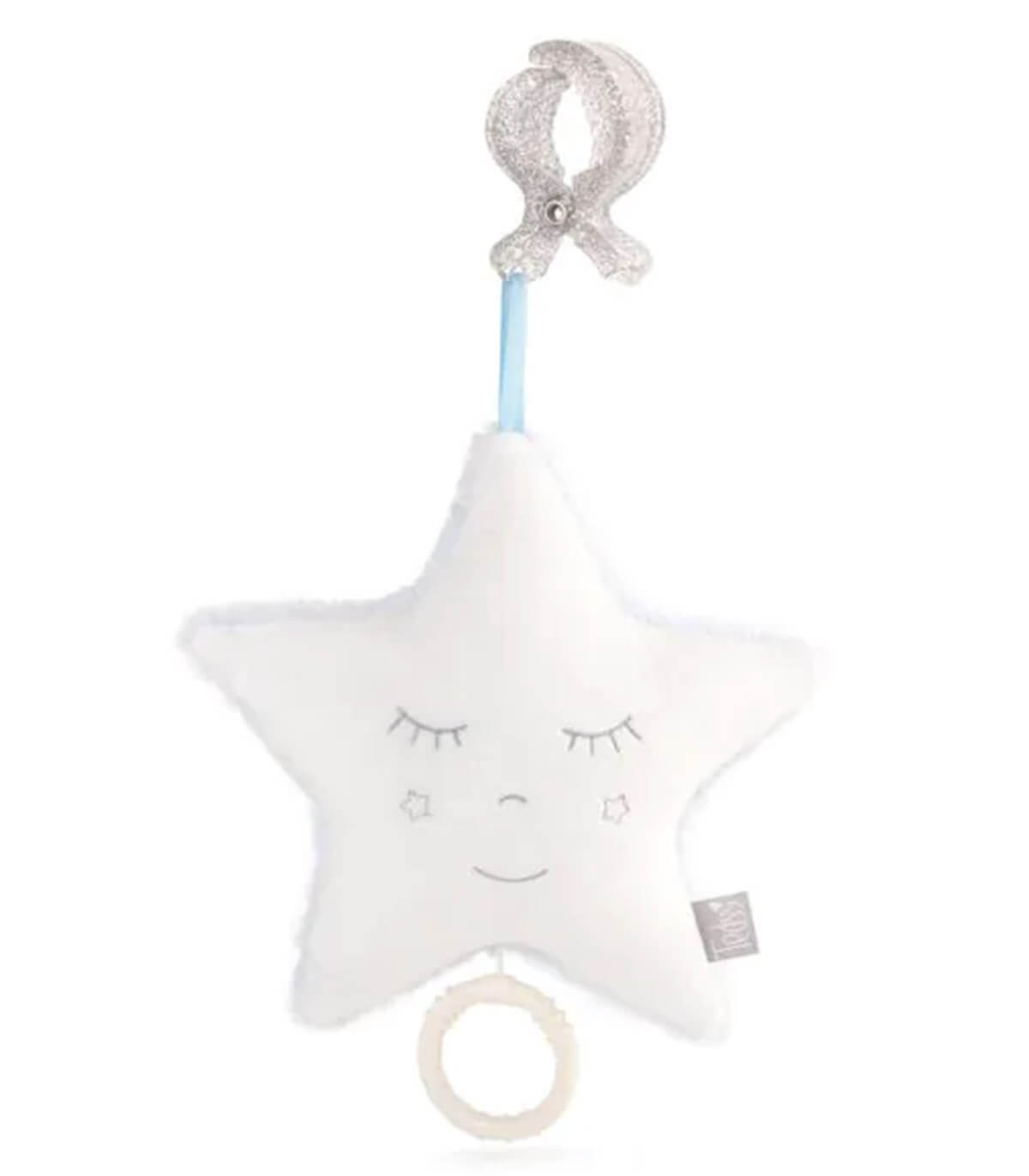 Бебешка плюшена латерна звезда в 2 нежни цвята, която е абсолютно необходим аксесоар за първите мигове от живота на всяко мъниче. Издърпайте връвчицата с помощта на пластмасовия ринг, за да зазвучи успокояващата мелодия и да превърне приспиването на вашето бебче в детска игра.