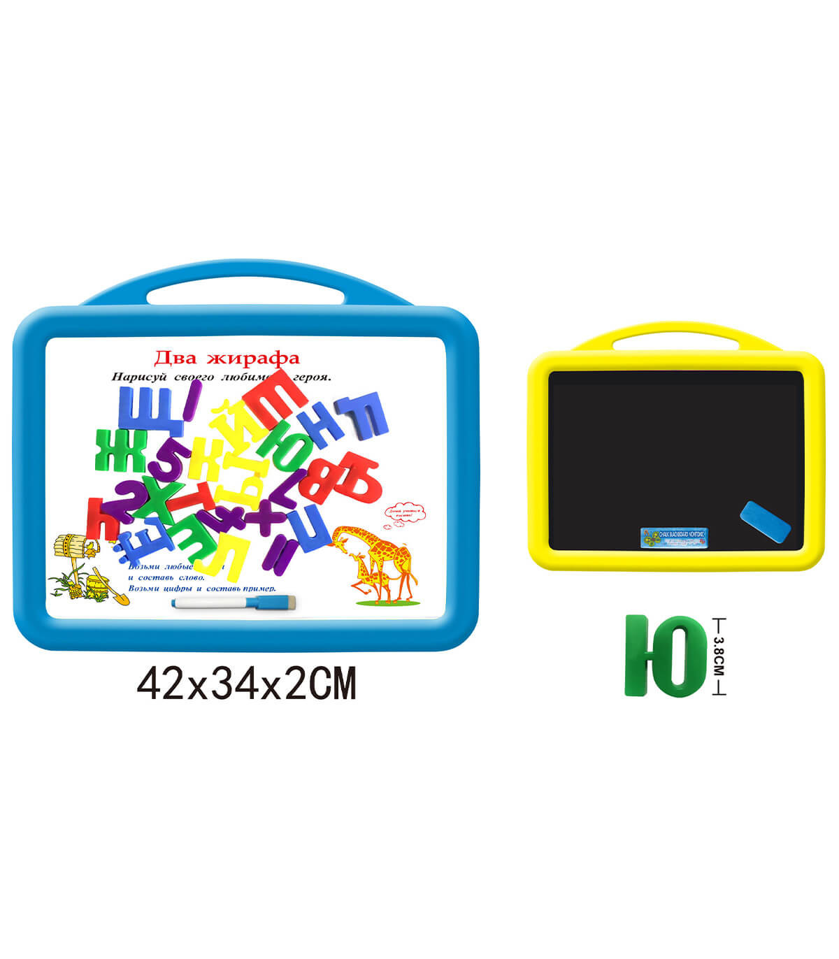 Образователна дъска за рисуване и писане с 2 страни – бяла магнитна и черна. С включени магнитни букви кирилица, цифри от 0 до 9, знаци -, +, ÷, ×, =, маркер, тебешир 2 бр., гъба. Опаковка: плик. Подходящо за момичета и момчета над 3 години.