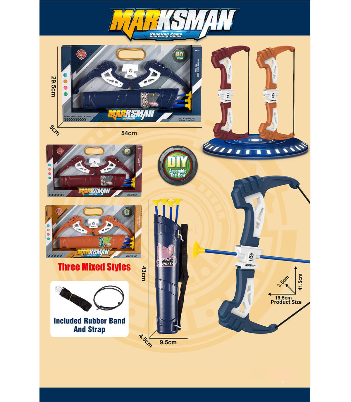 Детски лък с атрактивна визия, който ще привлече вниманието на всяко момче. Той идва с колчан и 4 стрели с вакуумни накрайници. Изработен от лека пластмаса и в подходящ размер за детски ръце, комплектът е идеален за игри както вкъщи, така и на открито.