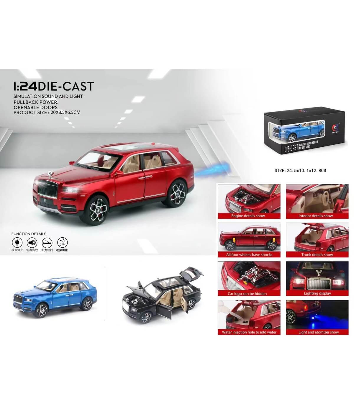 Метална кола играчка със звук и светлина, pull back функция, отварящи се врати, преден капак и багажник, пушек. Включена пипета за вода. Подходящо както за деца над 6 години, така и за любители колекционери.