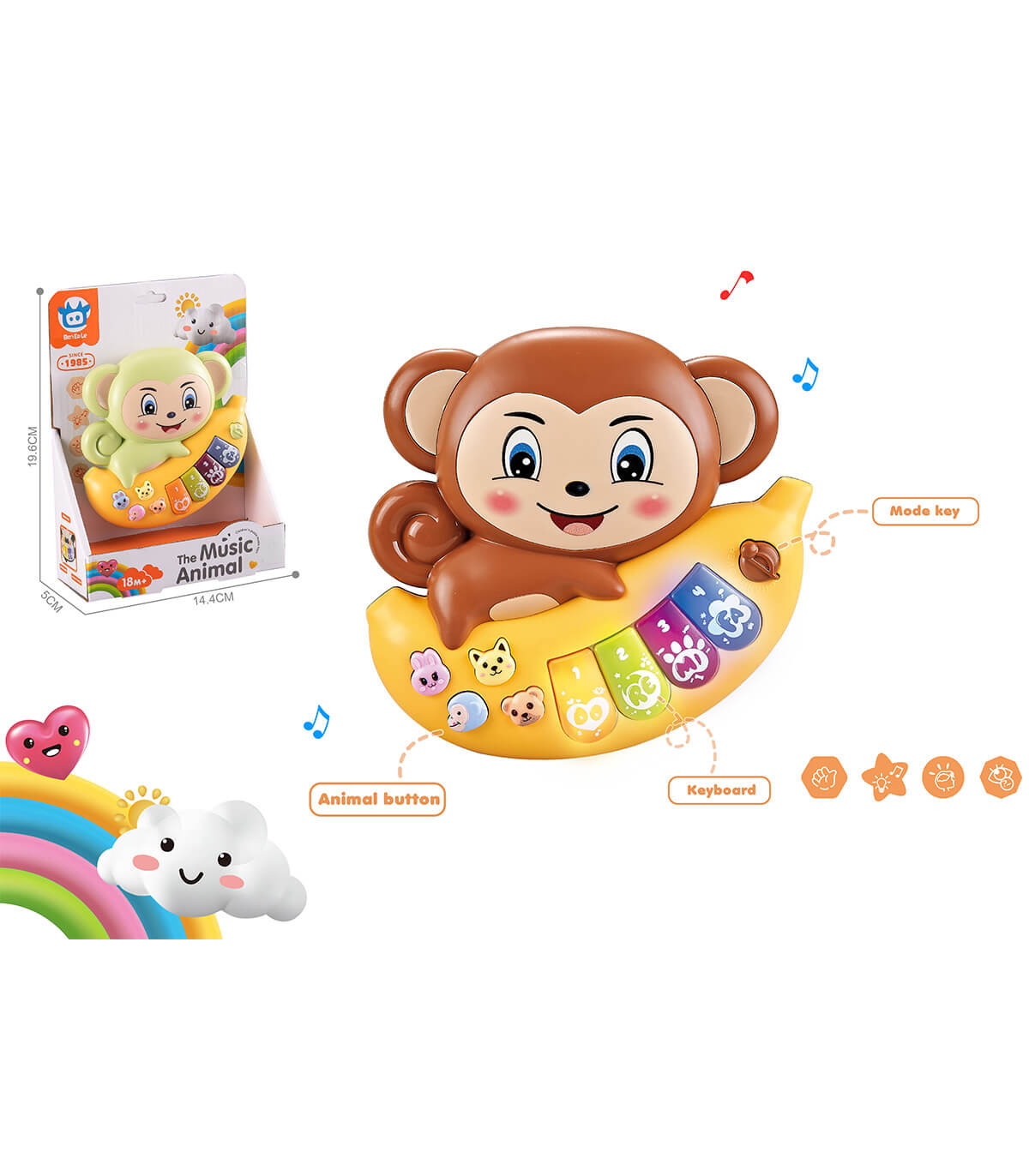 Светеща музикална играчка за бебе – маймунка с банан-пиано. Подходяща за момичета и момчета над 18 месеца.