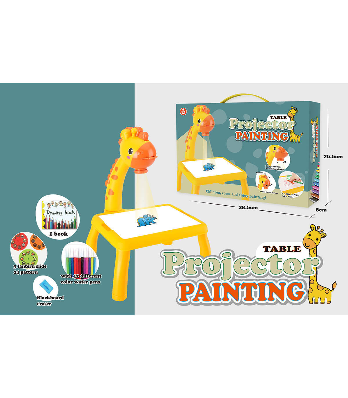 Тази пластмасова дъска за рисуване е лесна за използване и се превръща в маса само с прикрепването на крачетата. Това я прави удобна и практична за игра и рисуване. А проекторът-жираф е истинска забава, като прожектира весели картинки, които децата могат да очертаят върху бялата повърхност с помощта на включените в комплекта 12 цвята флумастери.