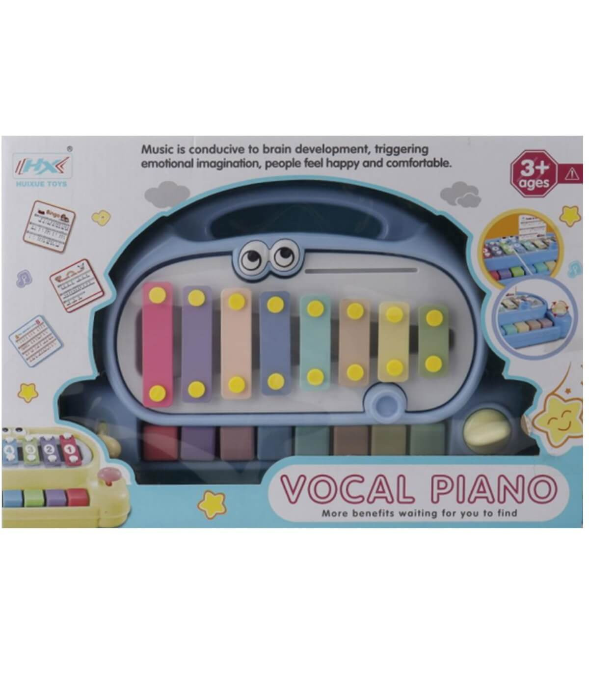 Детски музикален инструмент 2 в 1 – пиано и ксилофон. С включени 2 чукчета и 3 музикални карти с общо 6 песни. Подходящо за момичета и момчета над 3 години.