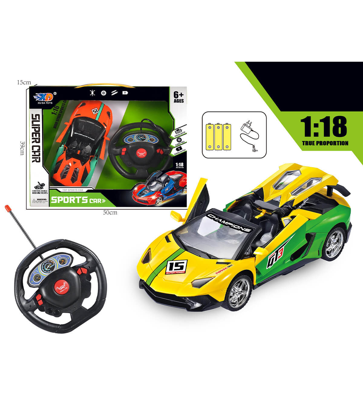 Спортна кола играчка с дистанционно волан. Екстри: гумирани колела, пълен радиоконтрол на движение, отварящи се врати, презареждащи се батерии, зарядно. Обхват на дистанционното: до 100 метра. Подходящо за момчета над 6 години. Идеален подарък за рожден ден, Коледа или друг специален повод.